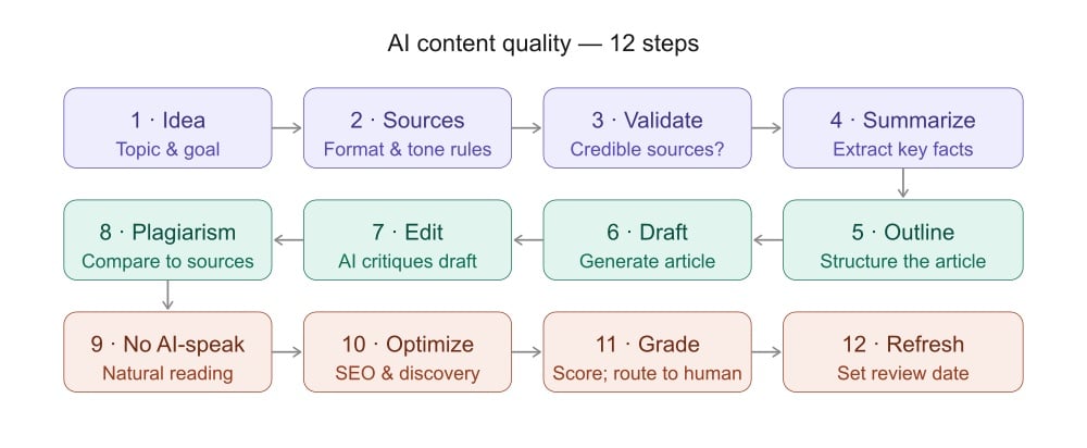 A flowchart titled "AI content quality — 12 steps" arranged in three rows of four steps each, connected by arrows in a serpentine pattern. Row 1 (purple, left to right): 1 · Idea — Topic & goal; 2 · Sources — Format & tone rules; 3 · Validate — Credible sources?; 4 · Summarize — Extract key facts. Row 2 (teal, right to left): 5 · Outline — Structure the article; 6 · Draft — Generate article; 7 · Edit — AI critiques draft; 8 · Plagiarism — Compare to sources. Row 3 (coral, left to right): 9 · No AI-speak — Natural reading; 10 · Optimize — SEO & discovery; 11 · Grade — Score; route to human; 12 · Refresh — Set review date.